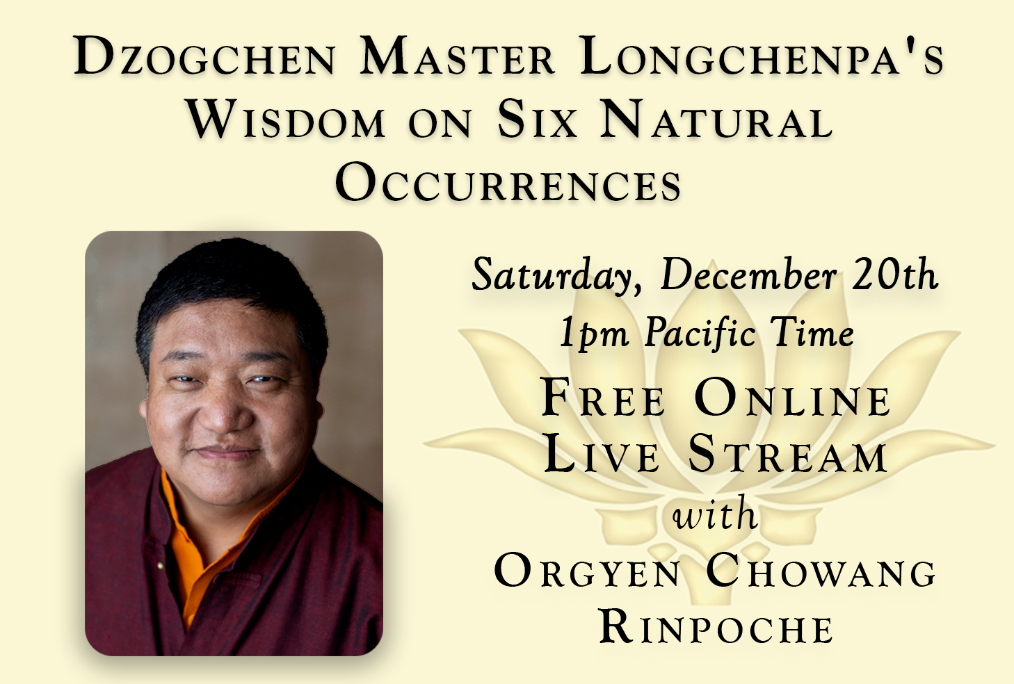 In this free live stream, Orgyen Chowang Rinpoche will be teaching on Dzogchen Master Longchenpa’s Wisdom on Six Natural Occurrences. This session will include an opportunity for questions and answers.