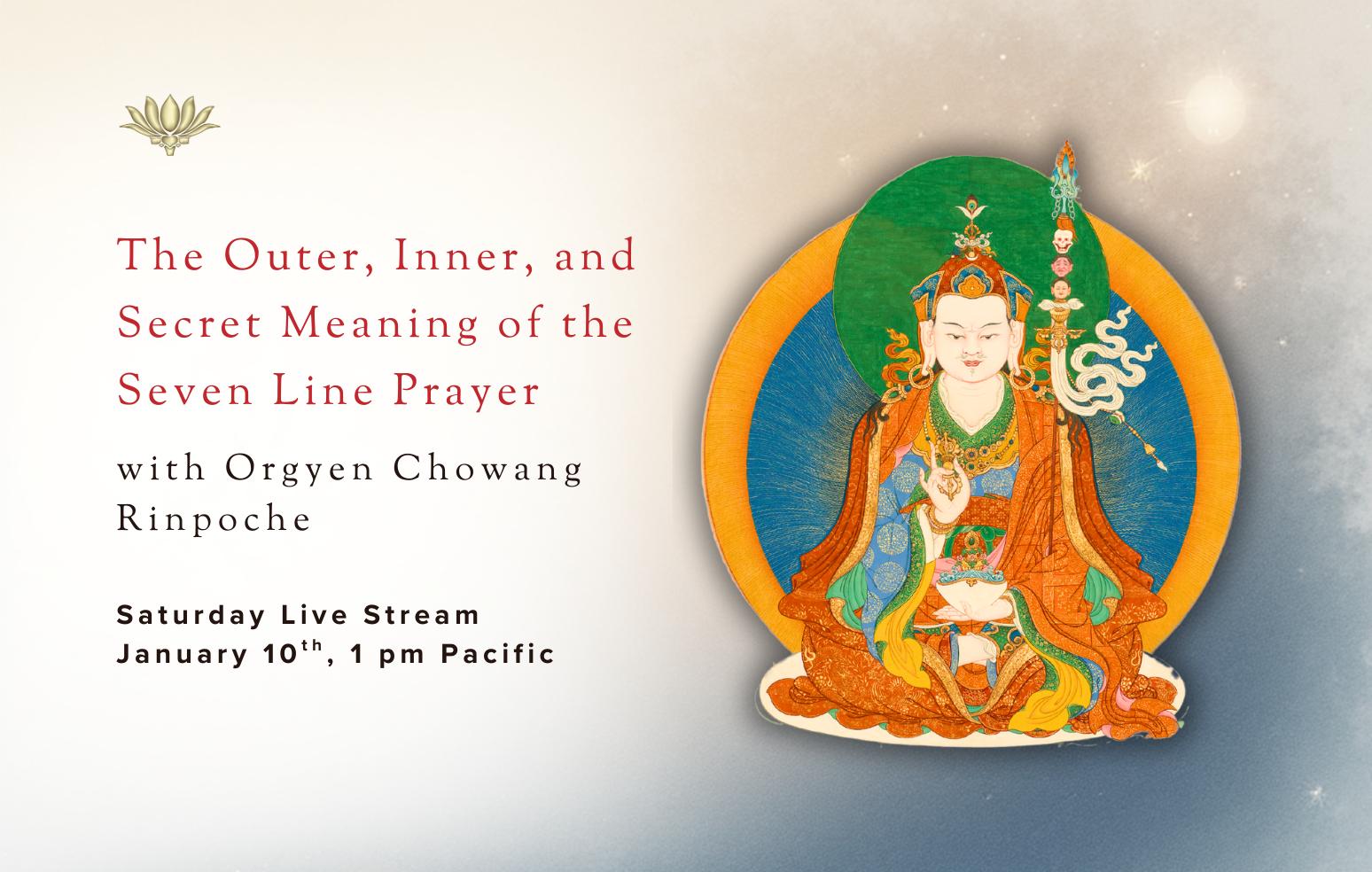 In this free live stream, Orgyen Chowang Rinpoche will be teaching on The Outer, Inner, and Secret Meaning of The Seven Line Prayer.