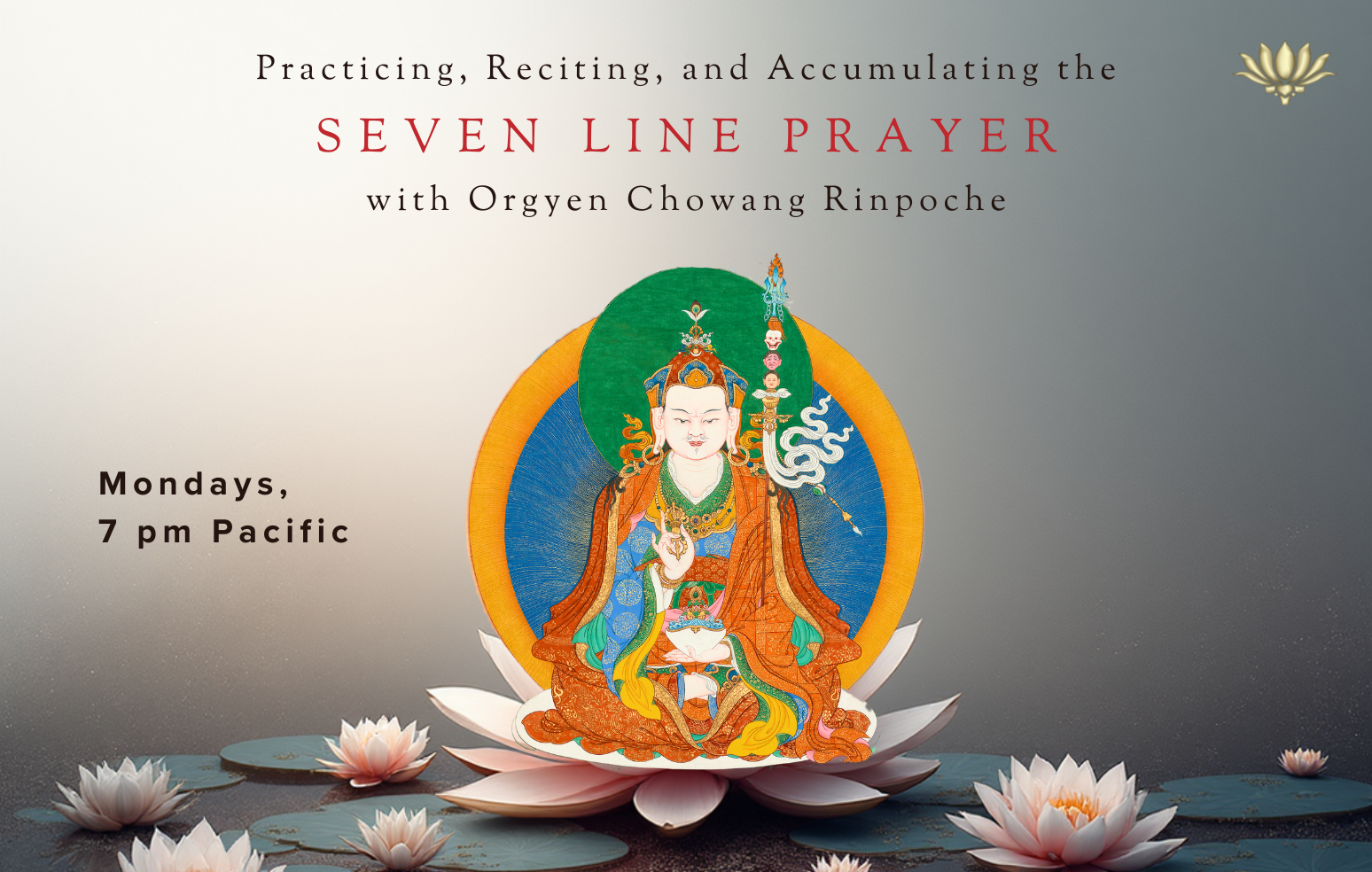 These free Monday live online sessions include brief opening comments from Orgyen Chowang Rinpoche, followed by guided group practice focused on reciting and accumulating the Seven Line Prayer, and conclude with short closing aspirations.