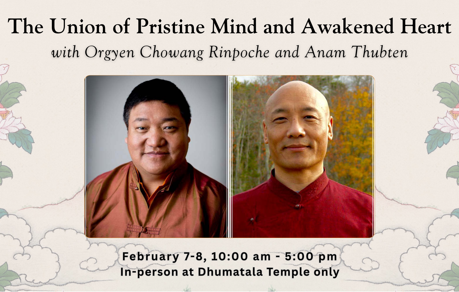 Anam Thubten and Orgyen Chowang Rinpoche will offer dharma talks and meditation practices to evoke our own pristine mind and awakened heart.